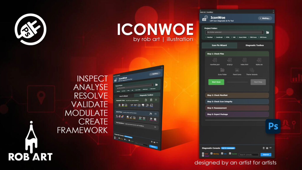 Use the IconWoe Wizard for a full end-to-end workflow that checks project structure, validates your manifest, verifies icon integrity, applies corrections, and confirms export readiness. Prefer hands-on control? The Toolbox gives you focused diagnostics, quick fixes, batch operations, and targeted repairs — all enforcing the same UXP rules, without forcing a linear workflow.