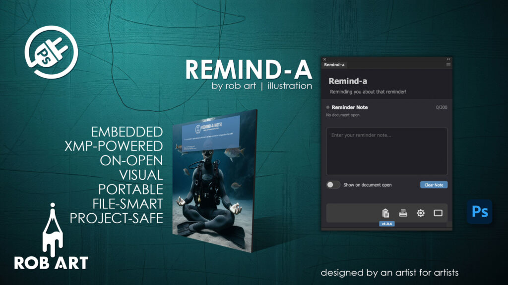 Remind-A is built for professionals who value reliability and workflow discipline. Whether you’re managing client revisions, tracking technical print requirements, coordinating handoffs, or juggling multiple commissions, Remind-A ensures nothing slips through the cracks. Simple, powerful, and permanently embedded, it’s your visual safeguard inside Photoshop.